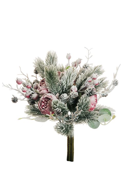 Mazzo Peonie Rosse Innevate con Pino, Pigne e Berries