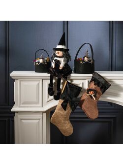 Befana Nera Tonda Seduta con Scopa e Sacchetto in Organza