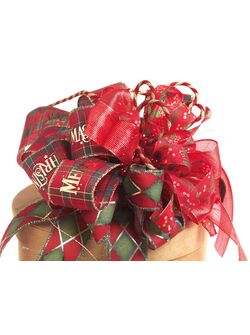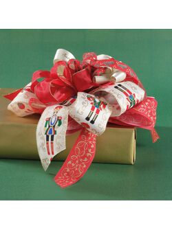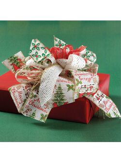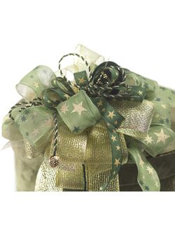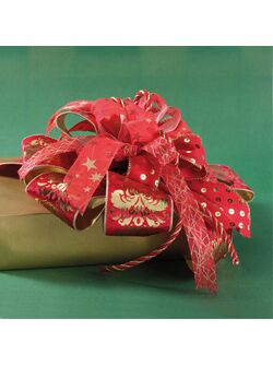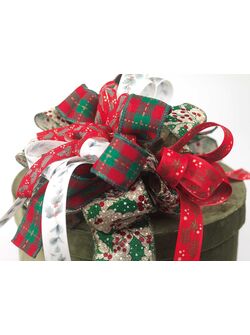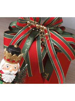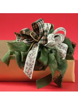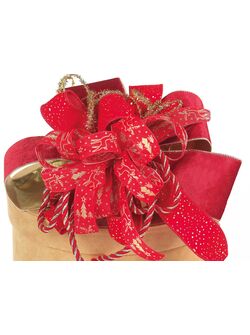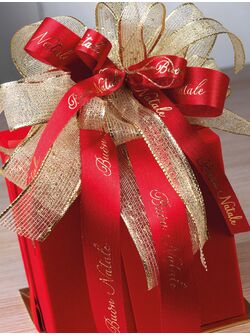 Nastro Tessuto Rosso Foglie Verdi e Bacche Oro con Glitter