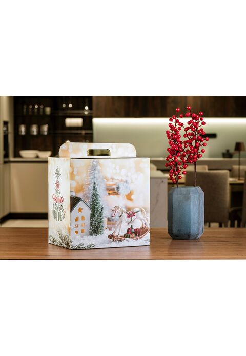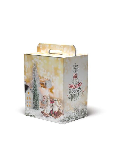 Misura cm 28x20,5x35h - 1 Bottiglia + 1 Panettone peso max 3,7 kg. Misura cm. 33x24x35 h. - 2 Bottiglie + 1 Panettone peso max 6 kg.