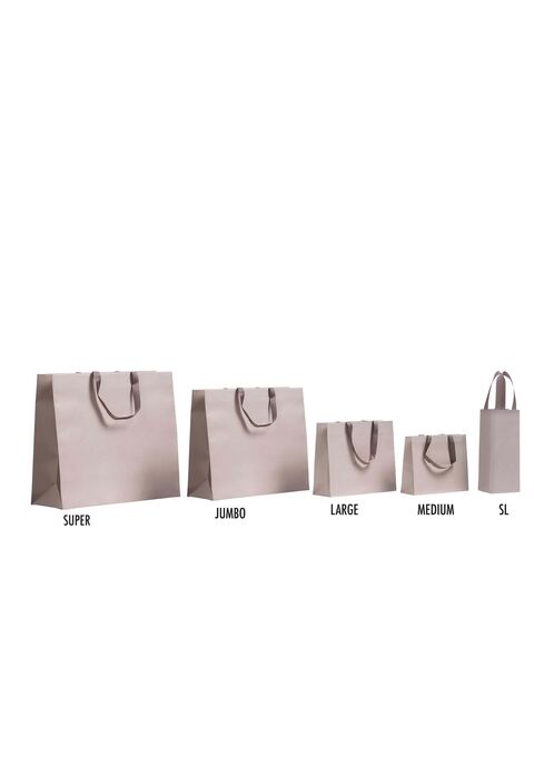 • Shopper in carta con maniglie in grosgrain in tinta con il colore della busta.